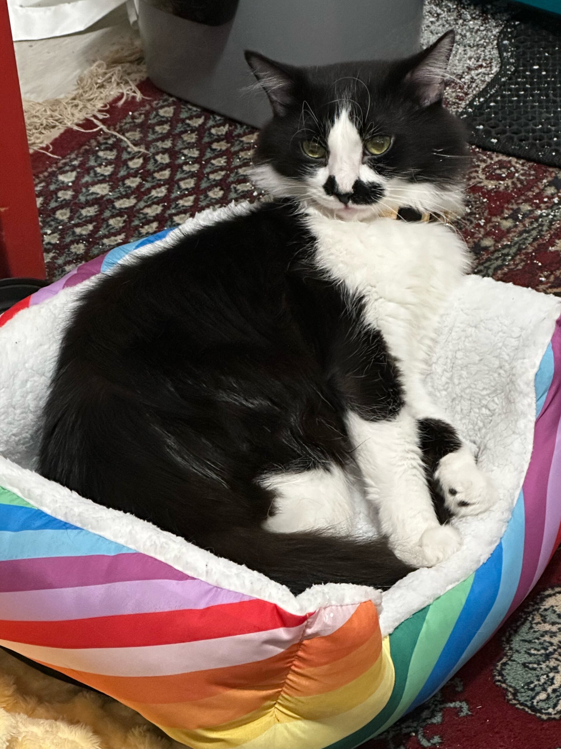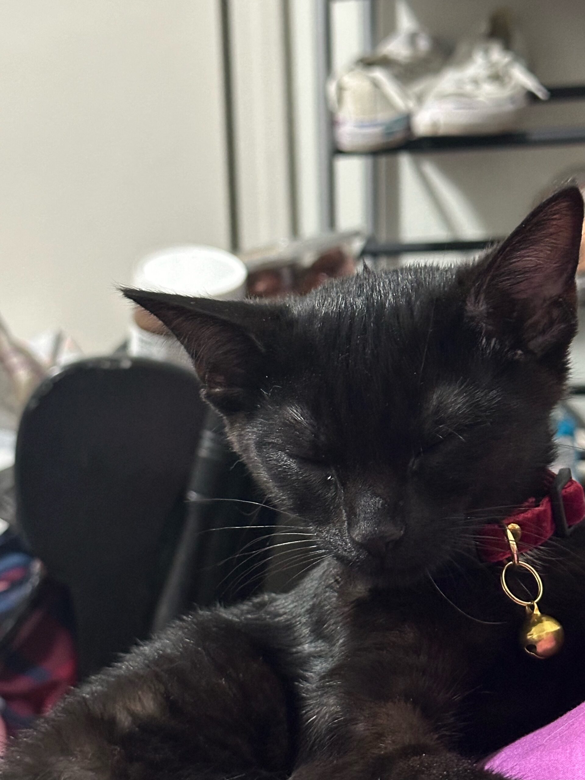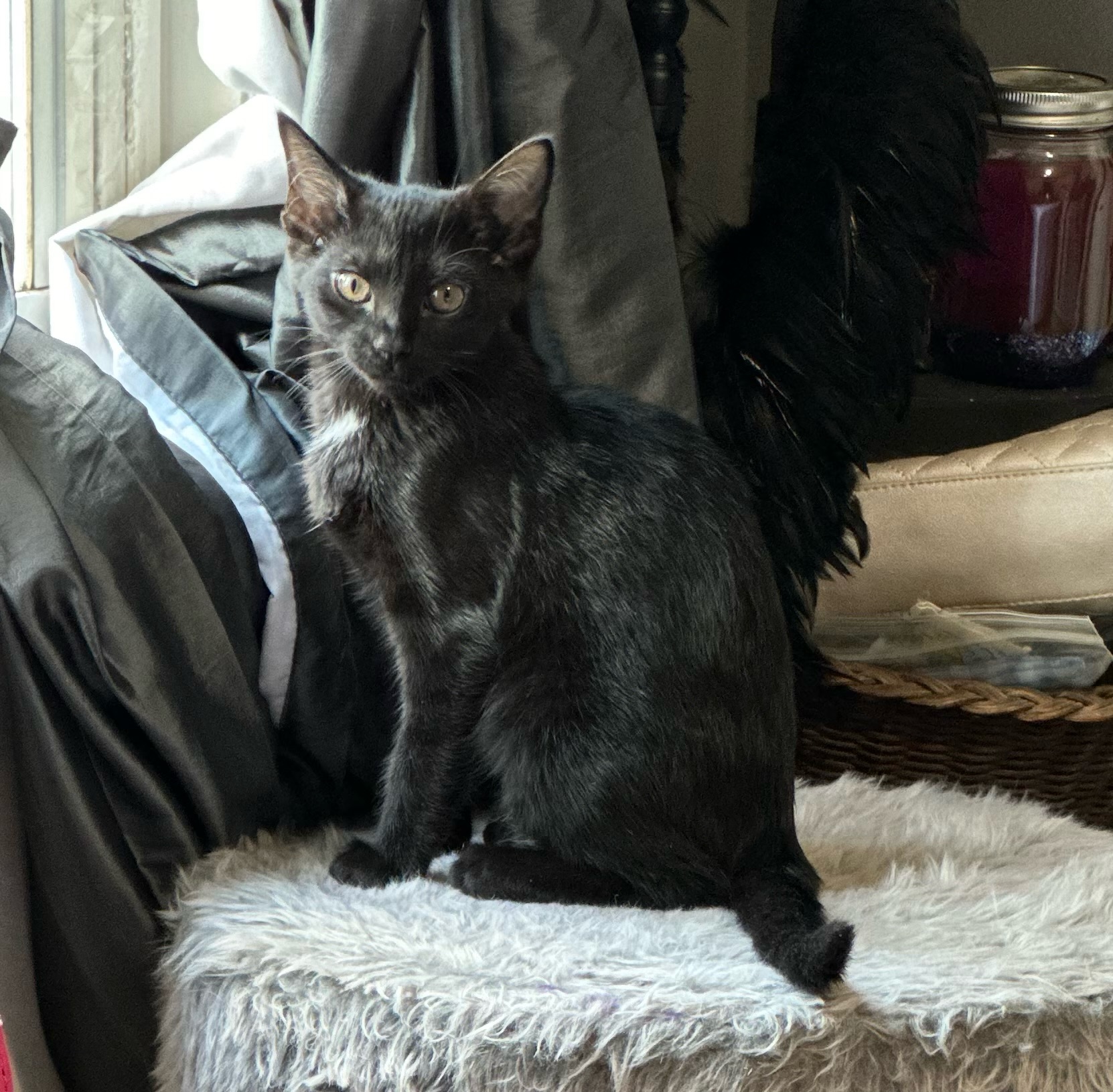 This is my baby Sweetie Petey (the tuxedo) that I got from y’all, and my mom’s baby Nadja (the black cat). They are both doing wonderful at home and are total snuggle bugs. They love churus and scritches!